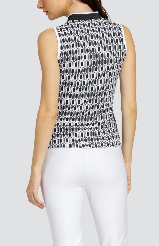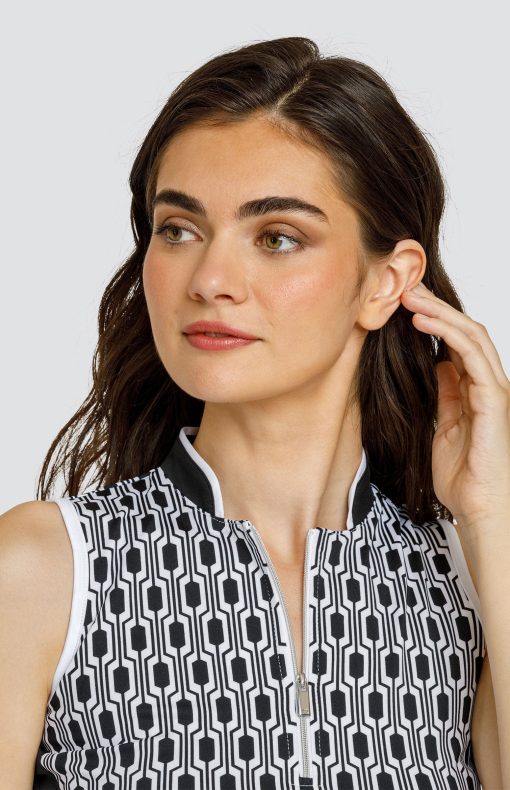 - Quarter-zip sleeveless golf top with novelty collar and inserts.